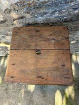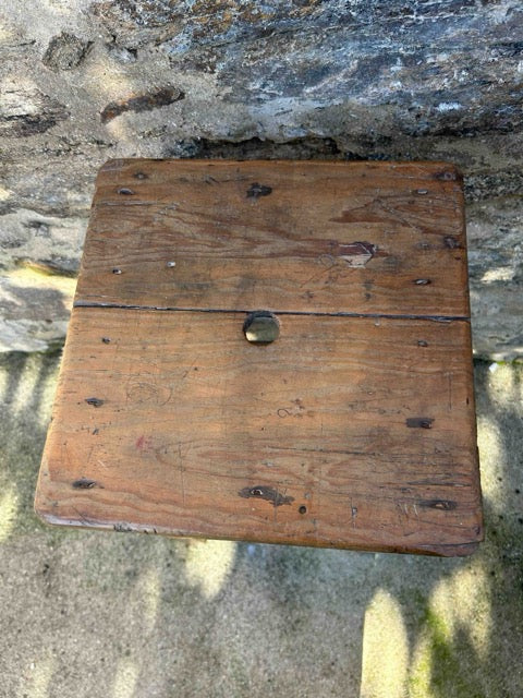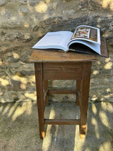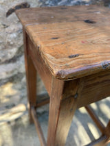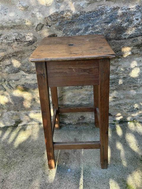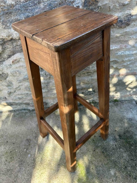 Banco mocho alto em madeira. Acabamento encerado, em toneladas em cor de mel. Com marcas do tempo e do uso.