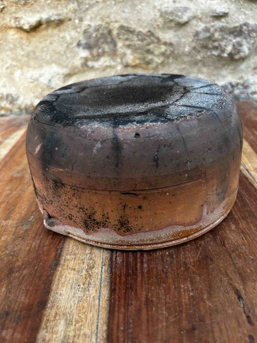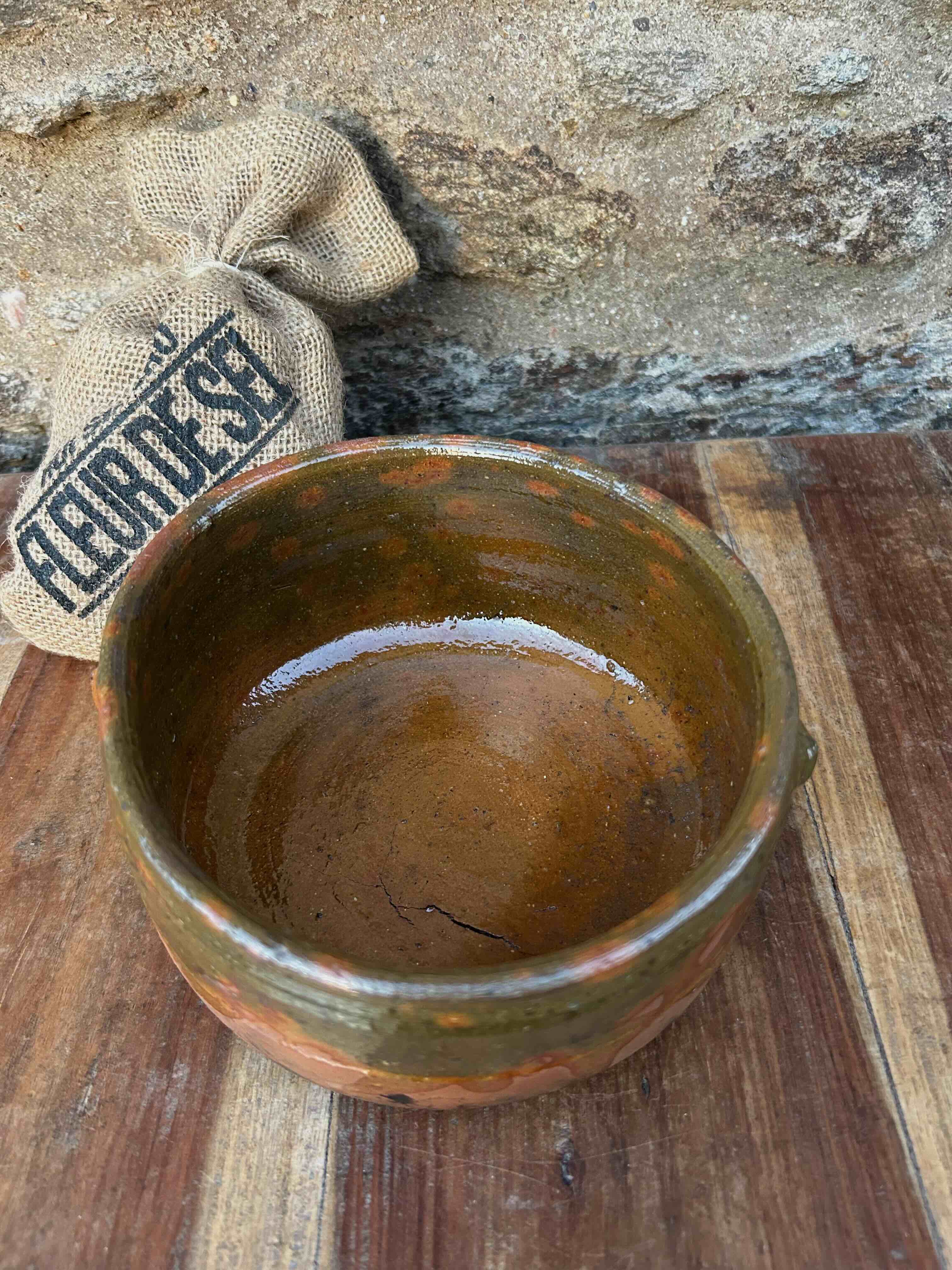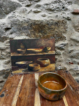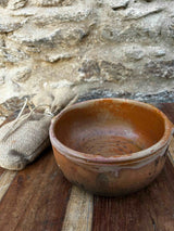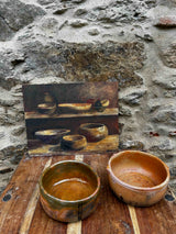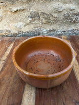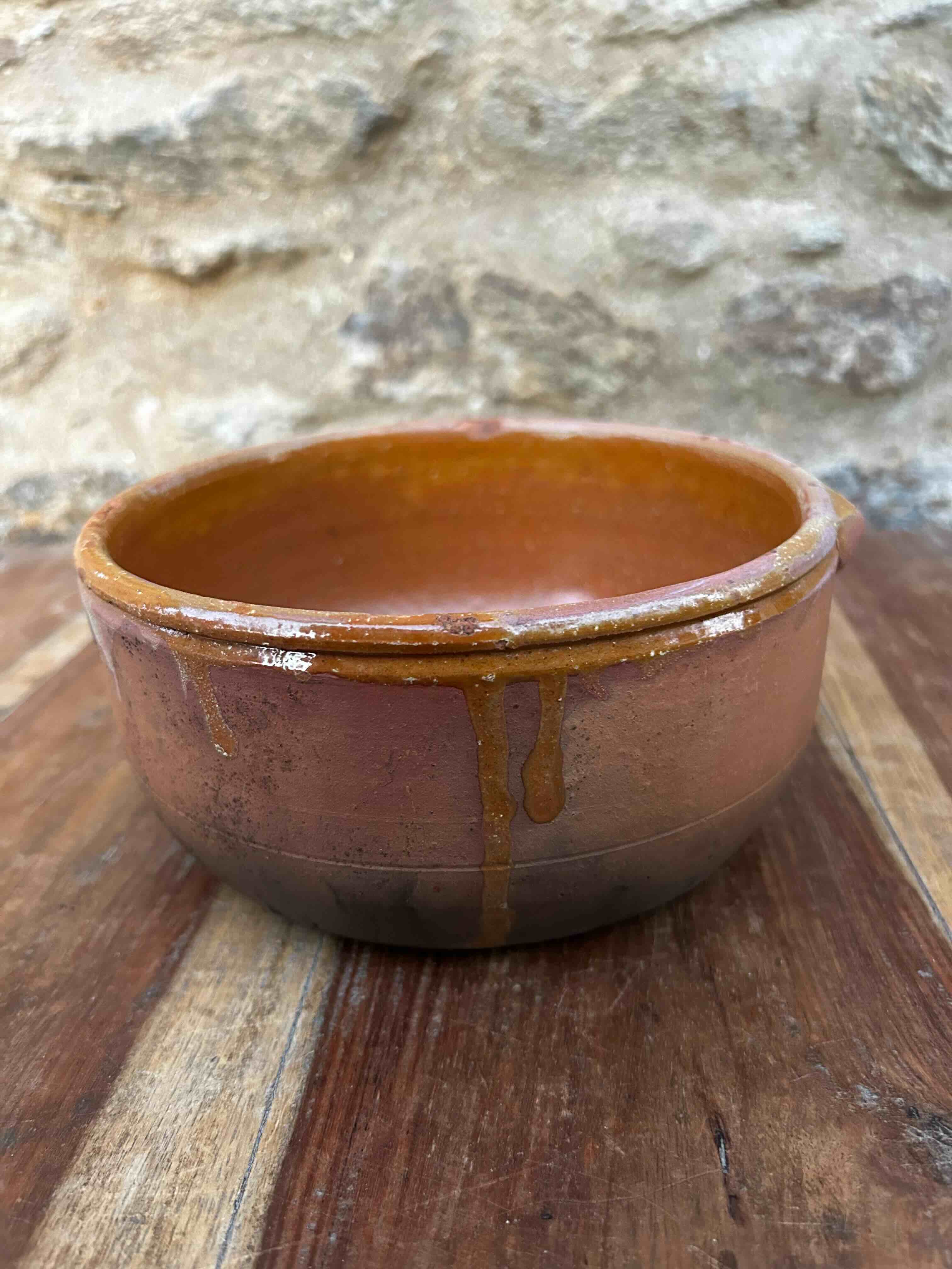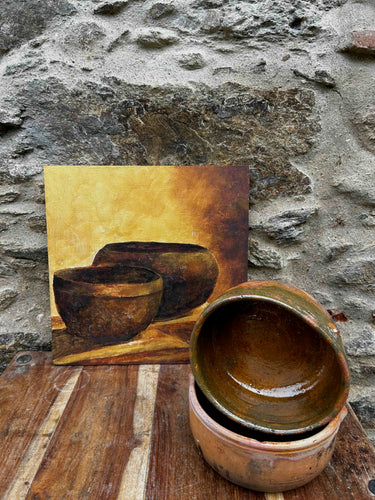 Par de taças de barro vidrado artesanal, com acabamento rústico. Formas simples, com sinais de trabalho manual visíveis na textura e pequenas irregularidades. Para decoração, uso funcional ou coleção de cerâmica tradicional rústica. Com marcas do uso e do tempo.