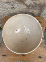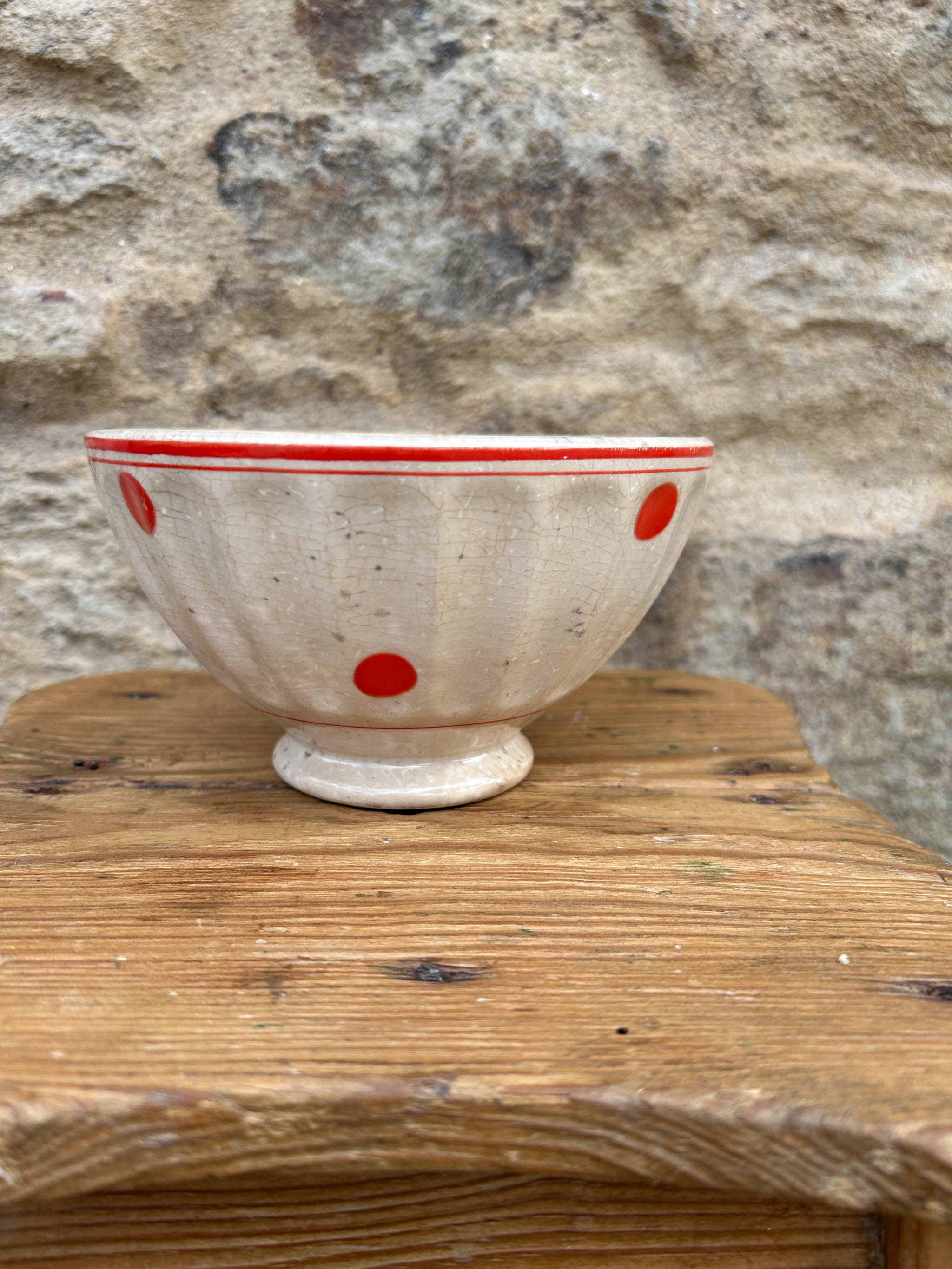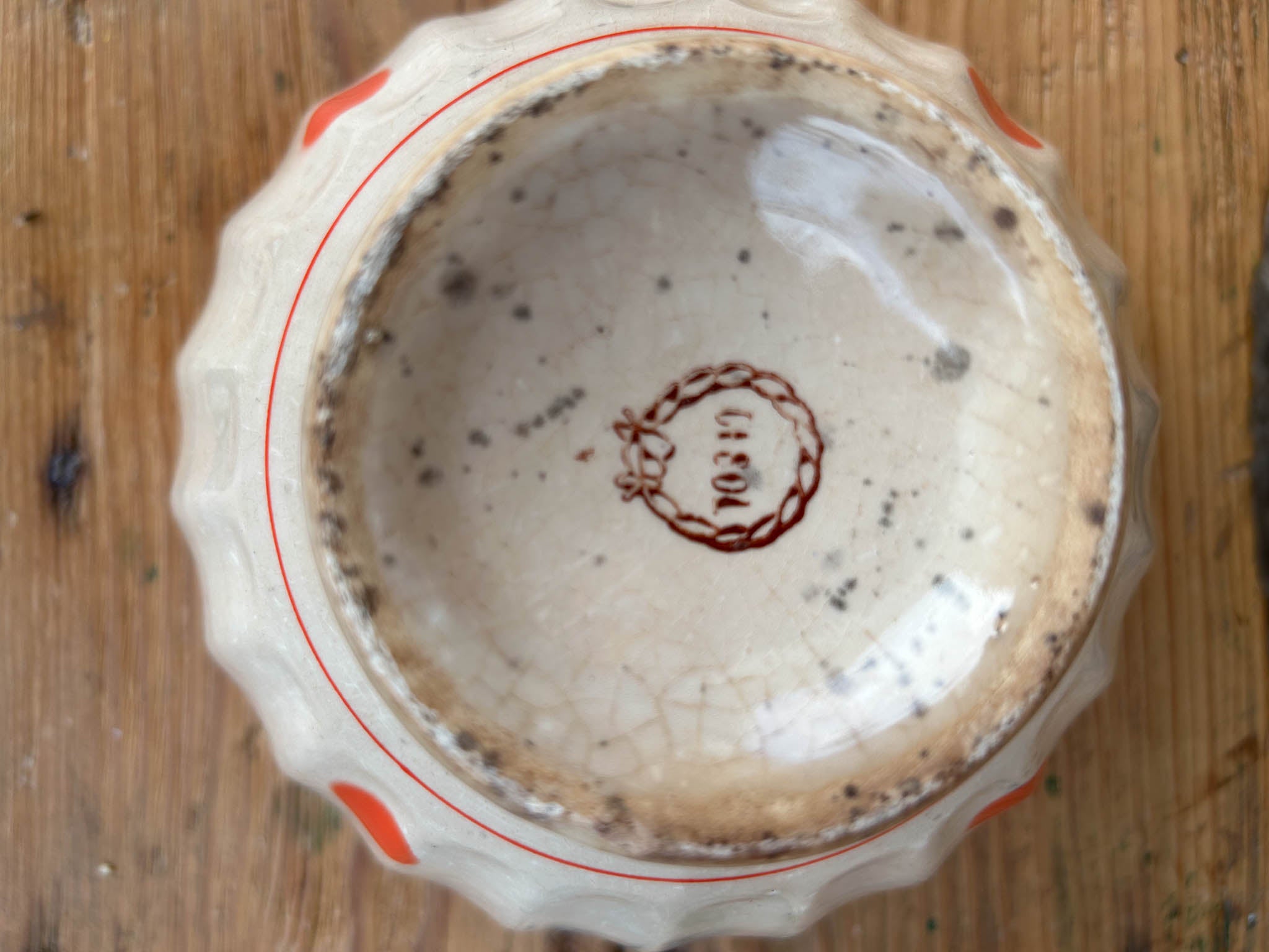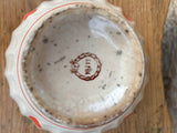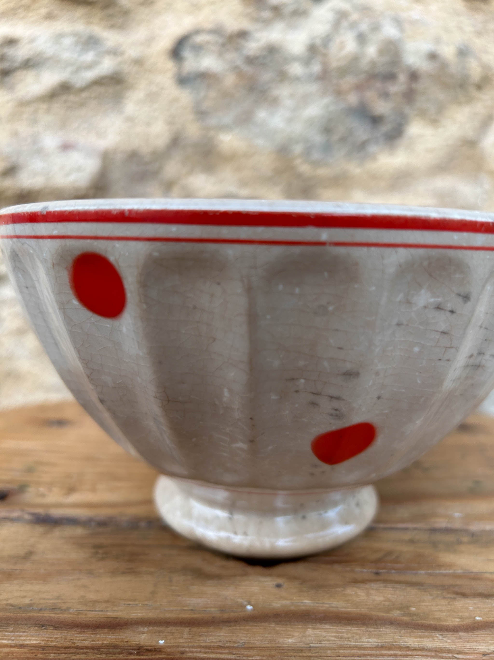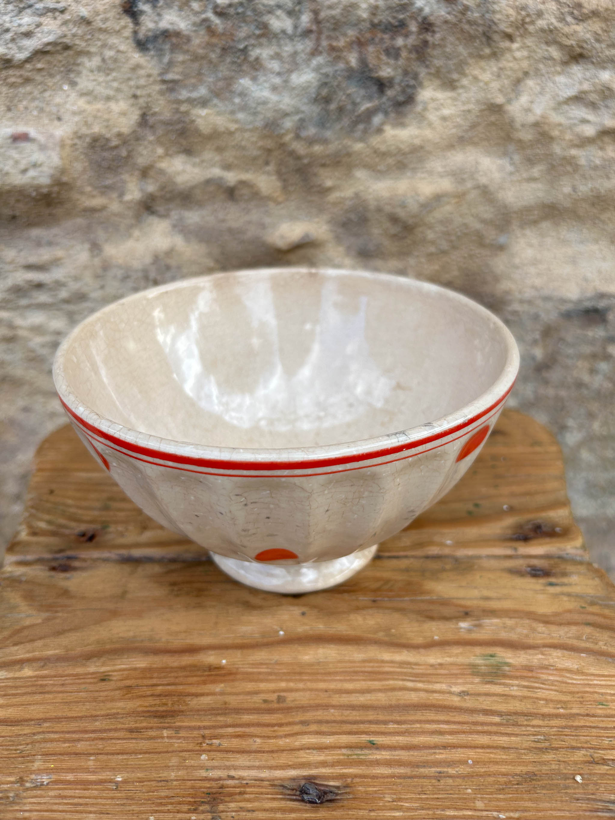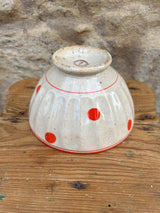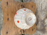 Taça decorativa de cerâmica de formato arredondado, com base pequena e levemente elevada. Peça em faiança, com textura craquelada, característica das peças antigas. Decoração com bolas de cor laranja dispostas de forma simétrica, com uma borda dupla parte superior, em contraste com o fundo próximo ao bege. Apresenta marcas do tempo.