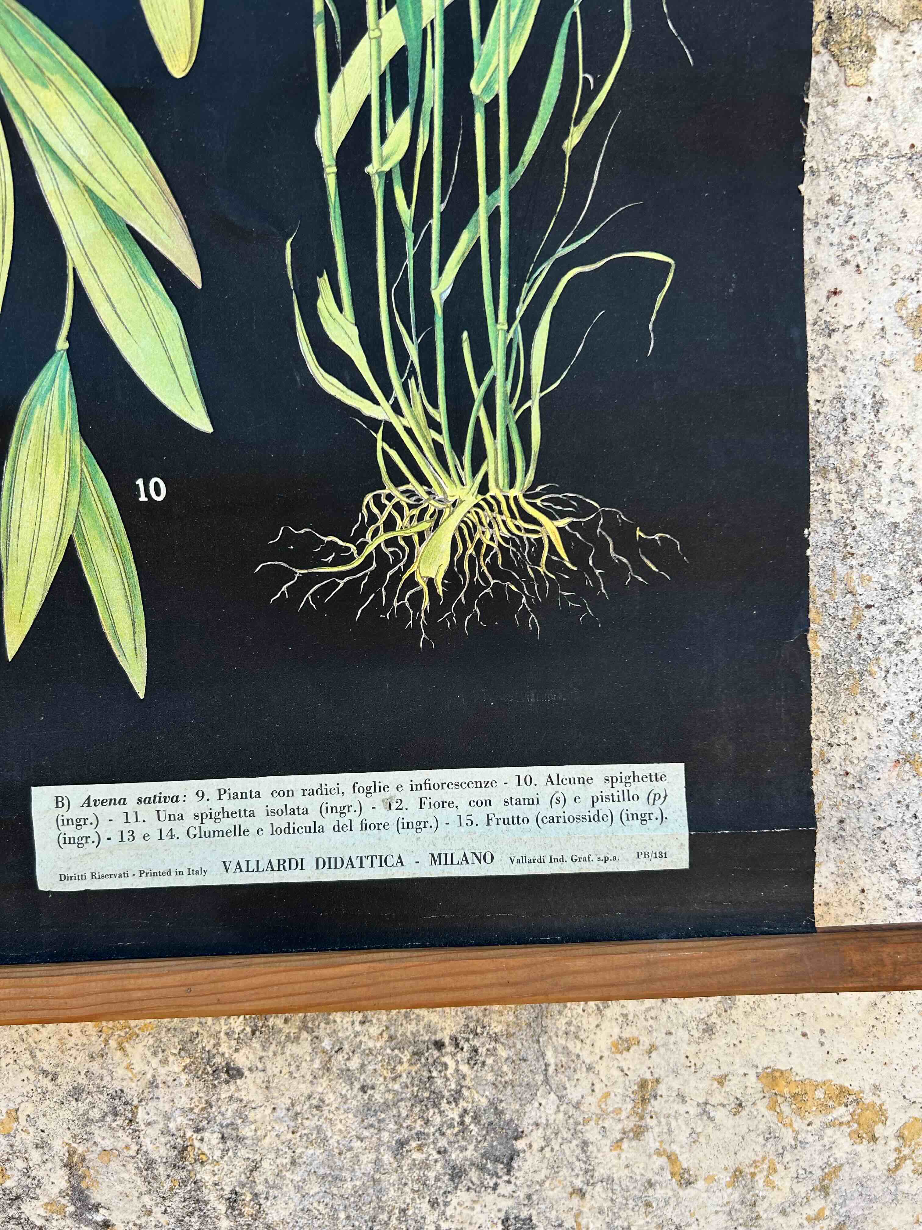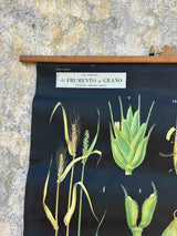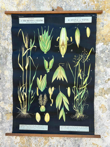 Tela botânica vintage com ilustração do trigo e da aveia. Peça original com caráter científico e decorativo, apresentando detalhes botânicos das espécies Triticum vulgare (trigo) e Avena sativa (aveia), incluindo estruturas das plantas, folhas e sementes. Impressa em tela, com suporte em madeira para pendurar, com o estilo clássico dos estudos botânicos. Versão em italiano, editada por VINCENZO NAPOLI. Com marcas do tempo.