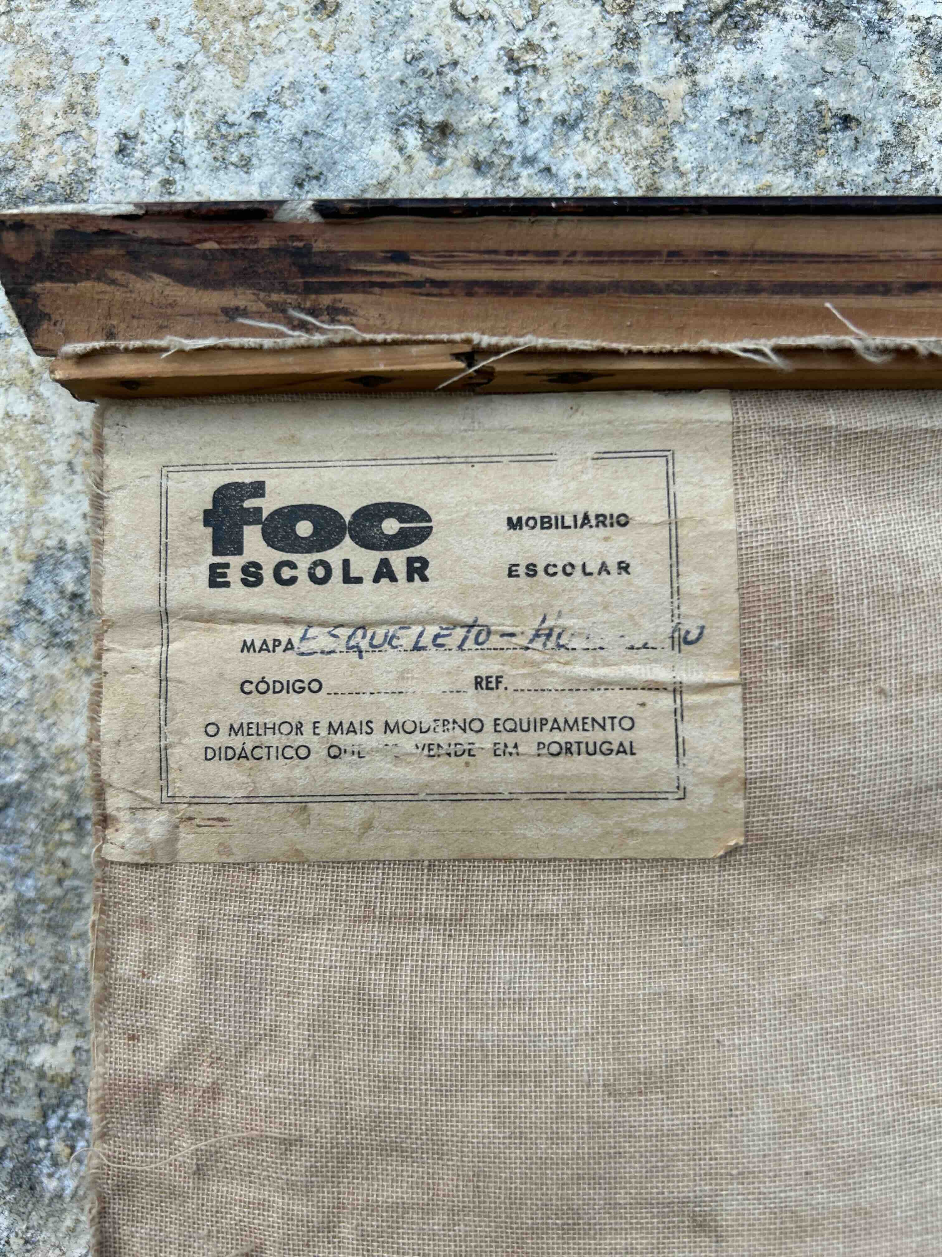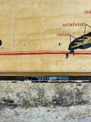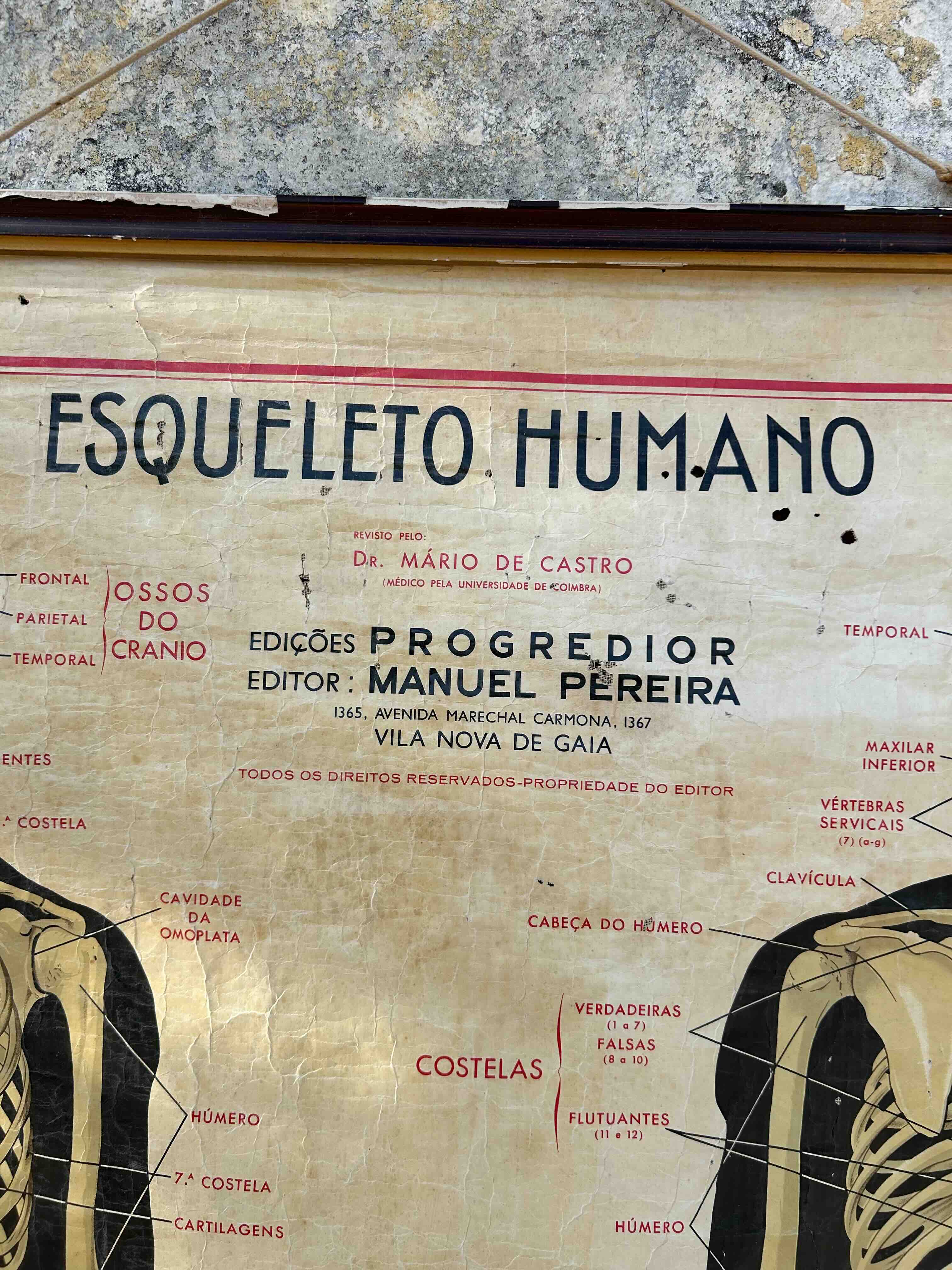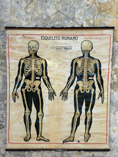 Tela anatómica vintage com ilustração do esqueleto humano. Peça original com caráter científico e decorativo, apresentando a estrutura óssea completa do corpo humano, vista de frente e de costas, com identificação detalhada dos principais ossos. Impressa em tela, com suporte em madeira para pendurar, com o estilo clássico das cartografias escolares. Versão em português, editada em 1971, pela Livraria Escolar Progredior, distribuída pela FOC Escolar.
