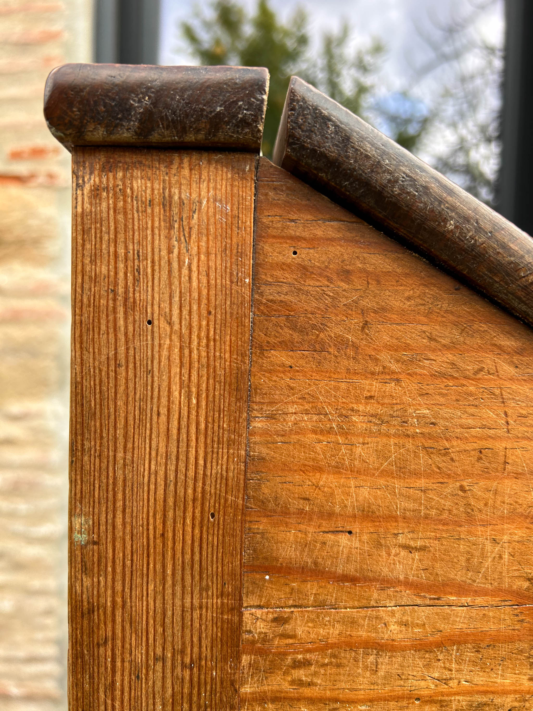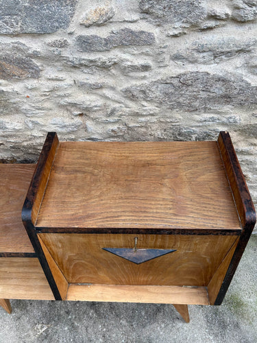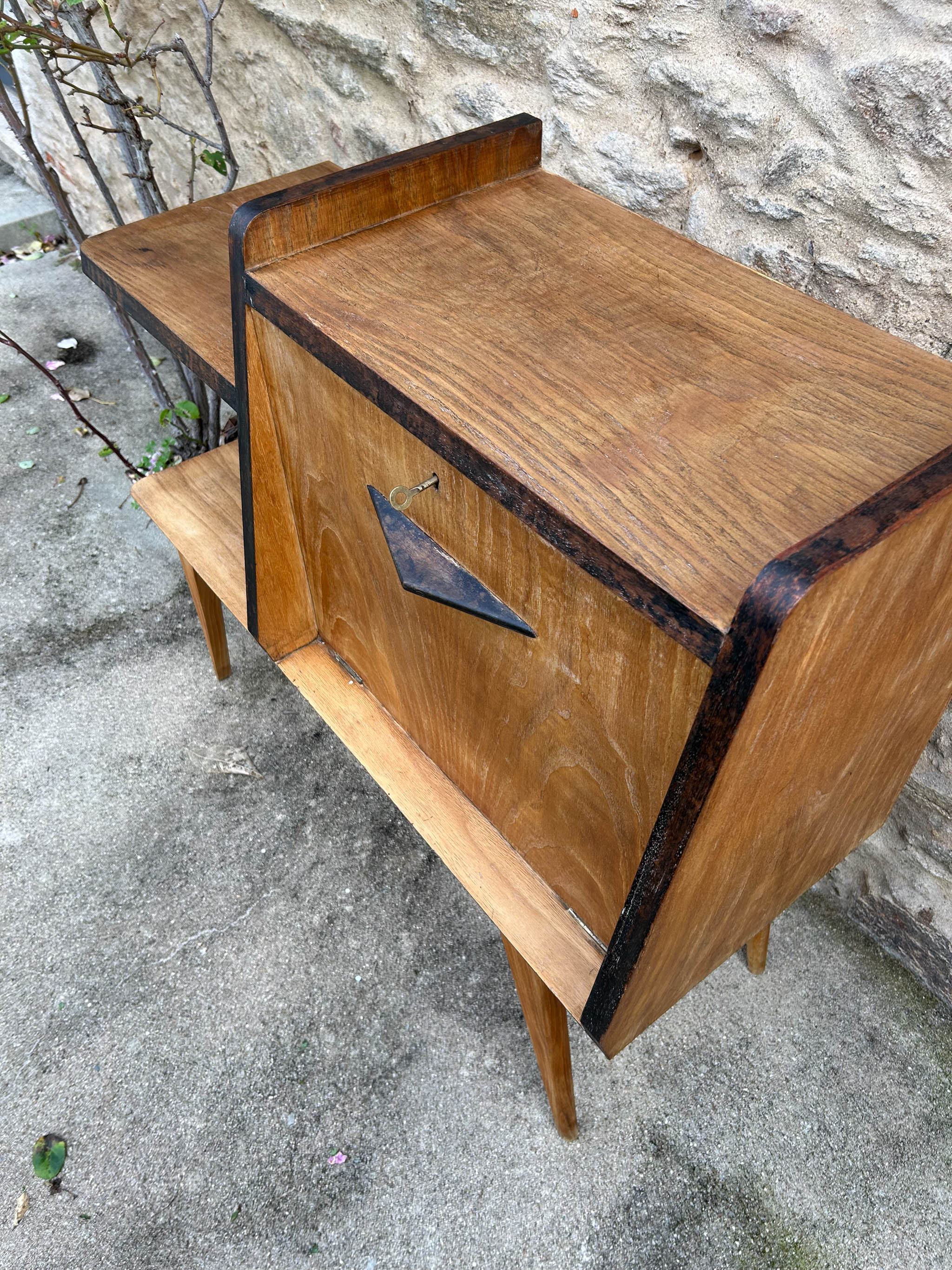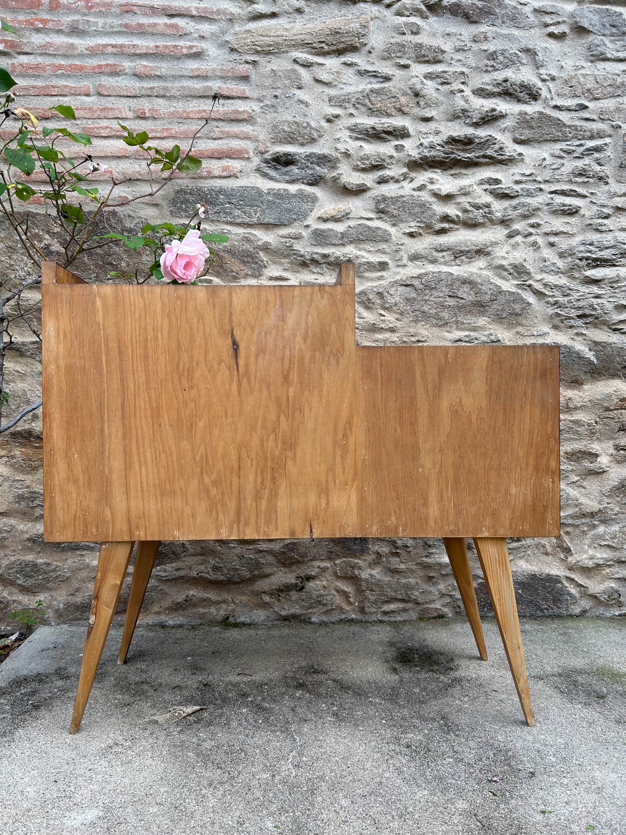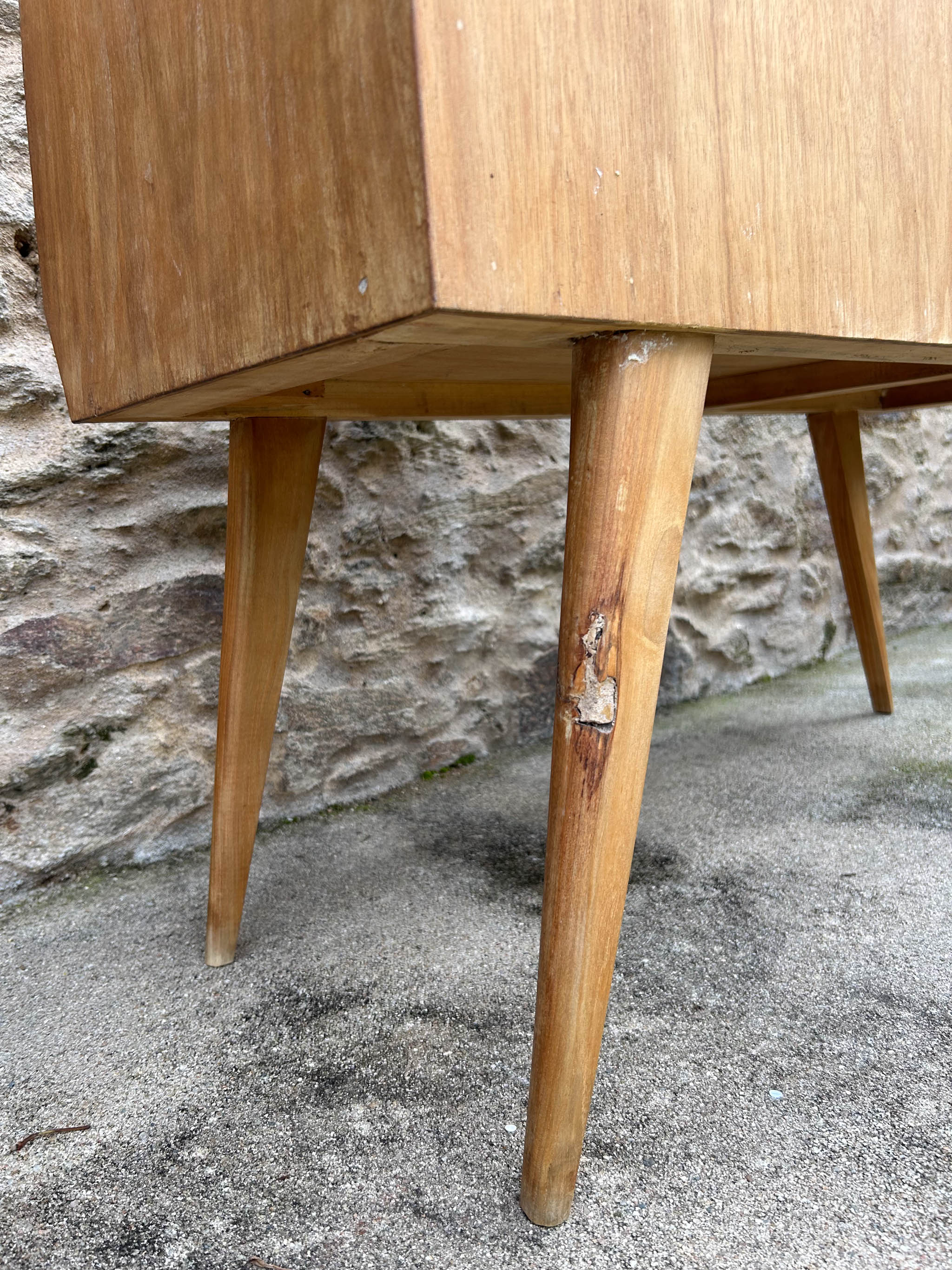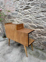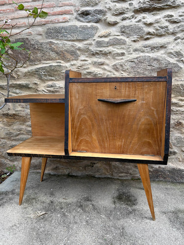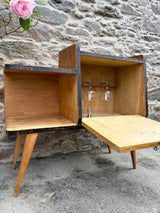 Móvel bar típico do estilo mid-century, de madeira com um acabamento natural. Com marcas do tempo.
