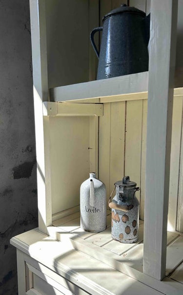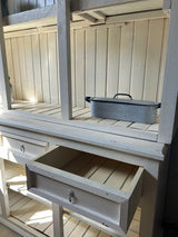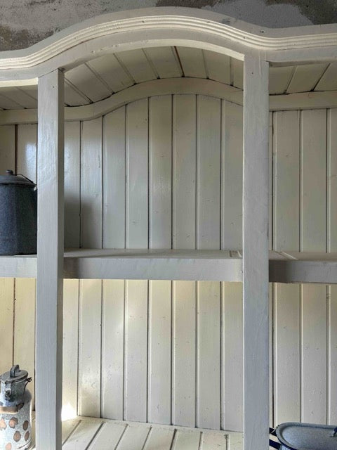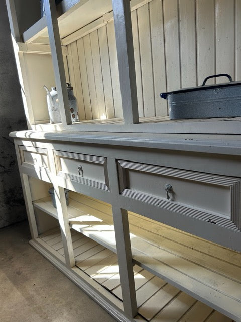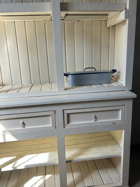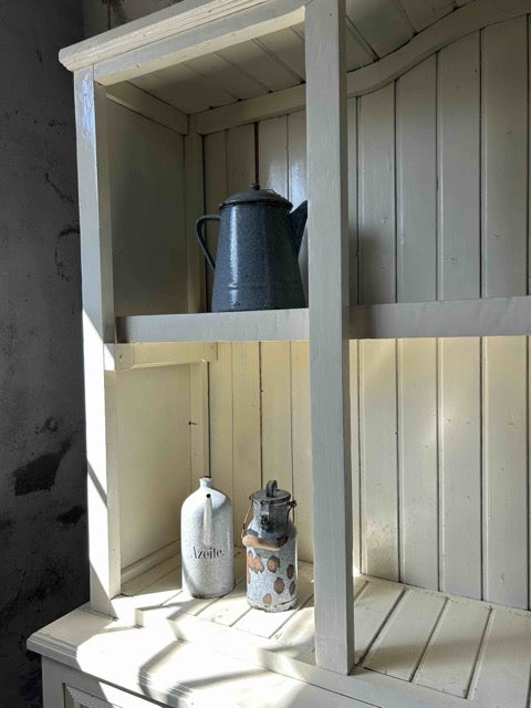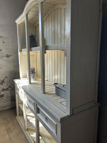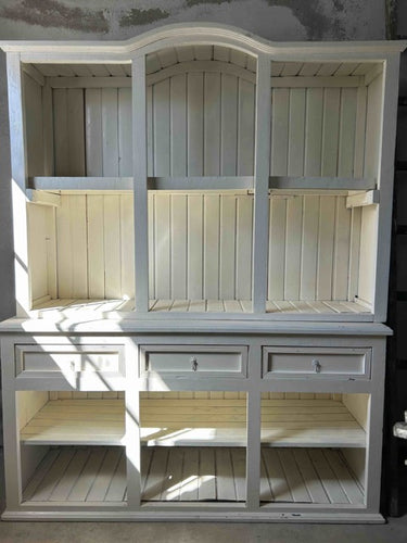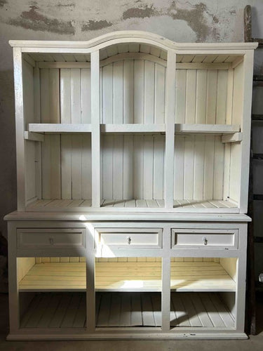 Armário aparador com parte superior aberta ou armário de cozinha estilo country. Em madeira maciça, pintada de branco. Parte superior aberta, com divisórias verticais e fundo em ripas, com arco decorativo no topo. Parte inferior com três gavetas alinhadas na parte superior e três compartimentos abertos na base. Estilo rústico / farmhouse, com acabamento simples e funcional. Adequado para cozinhas, salas de jantar ou espaços decorativos com estilo campestre. Com marcas do tempo.